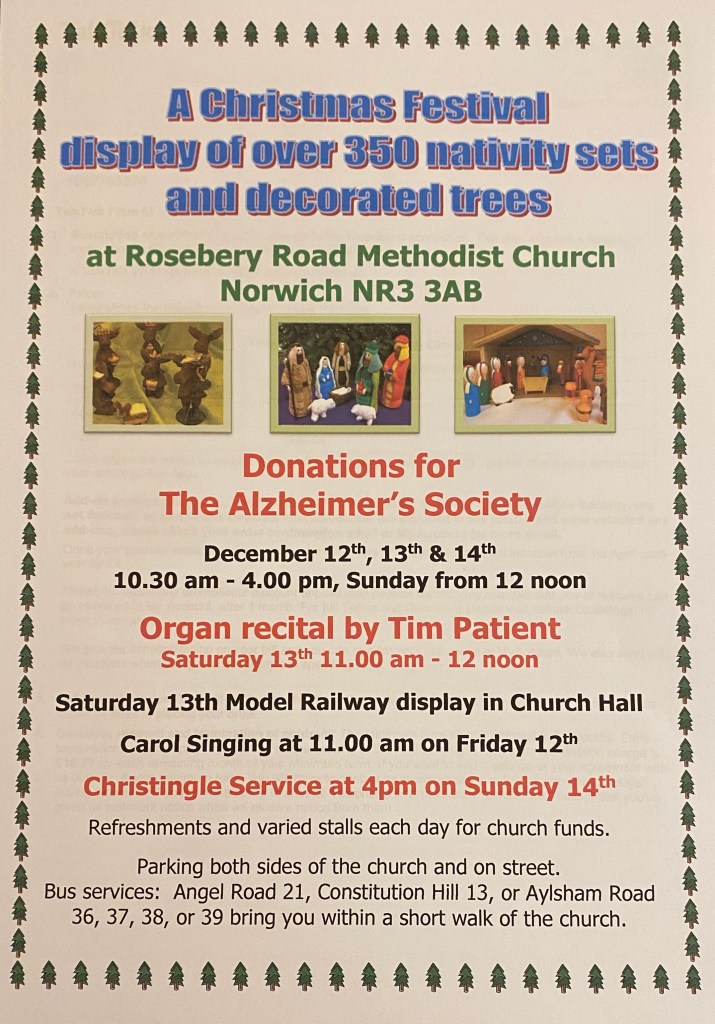 The Festival will be open on Saturday 6th, Sunday 7th, Friday 12th, Saturday 13th and Sunday 14th December from 10.30am to 4.00pm (from 12 noon on the Sundays), and this year’s chosen charity is the Alzheimer’s Society. As always, there will be a large and varied display of nativity sets and decorated trees.